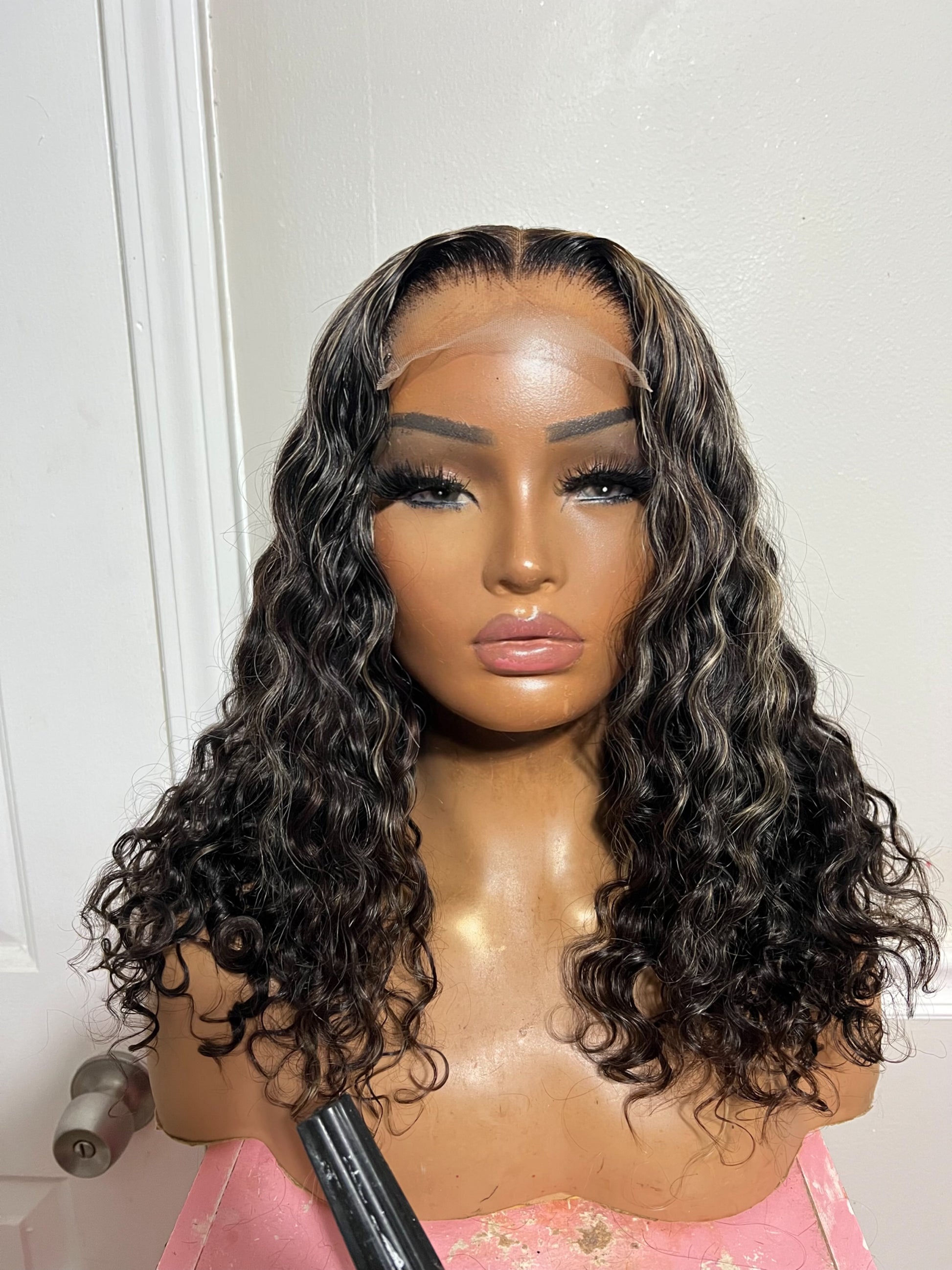 4x4 transparent lace closure with 3 bundles of deepwave virgin hair Baddie on a budget collection… 7a grade hair quality bundles. Unit is sewing machine constructed on black mesh dome cap. Custom colored with blonde highlights. All units come ready to wear with a preplucked hairline, bleached knots and styled to your liking.( middle part, curls) & ready to wear. Includes adjustable elastic band and combs for a glueless fit