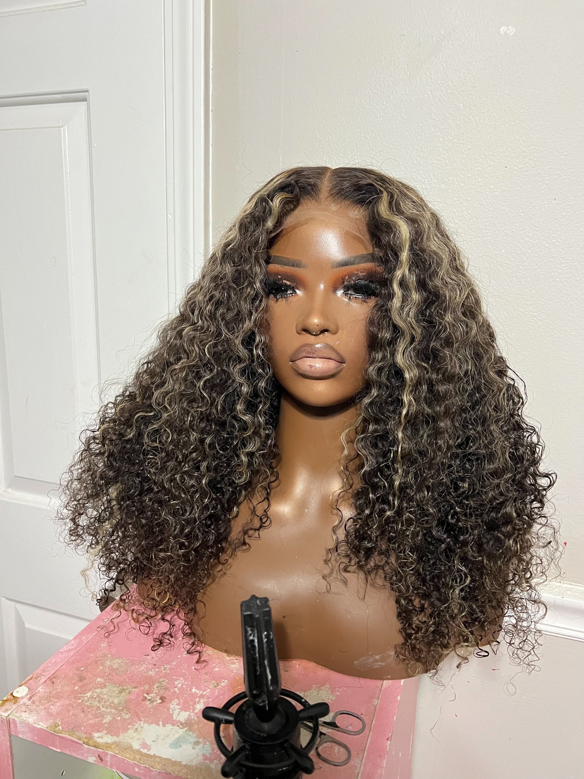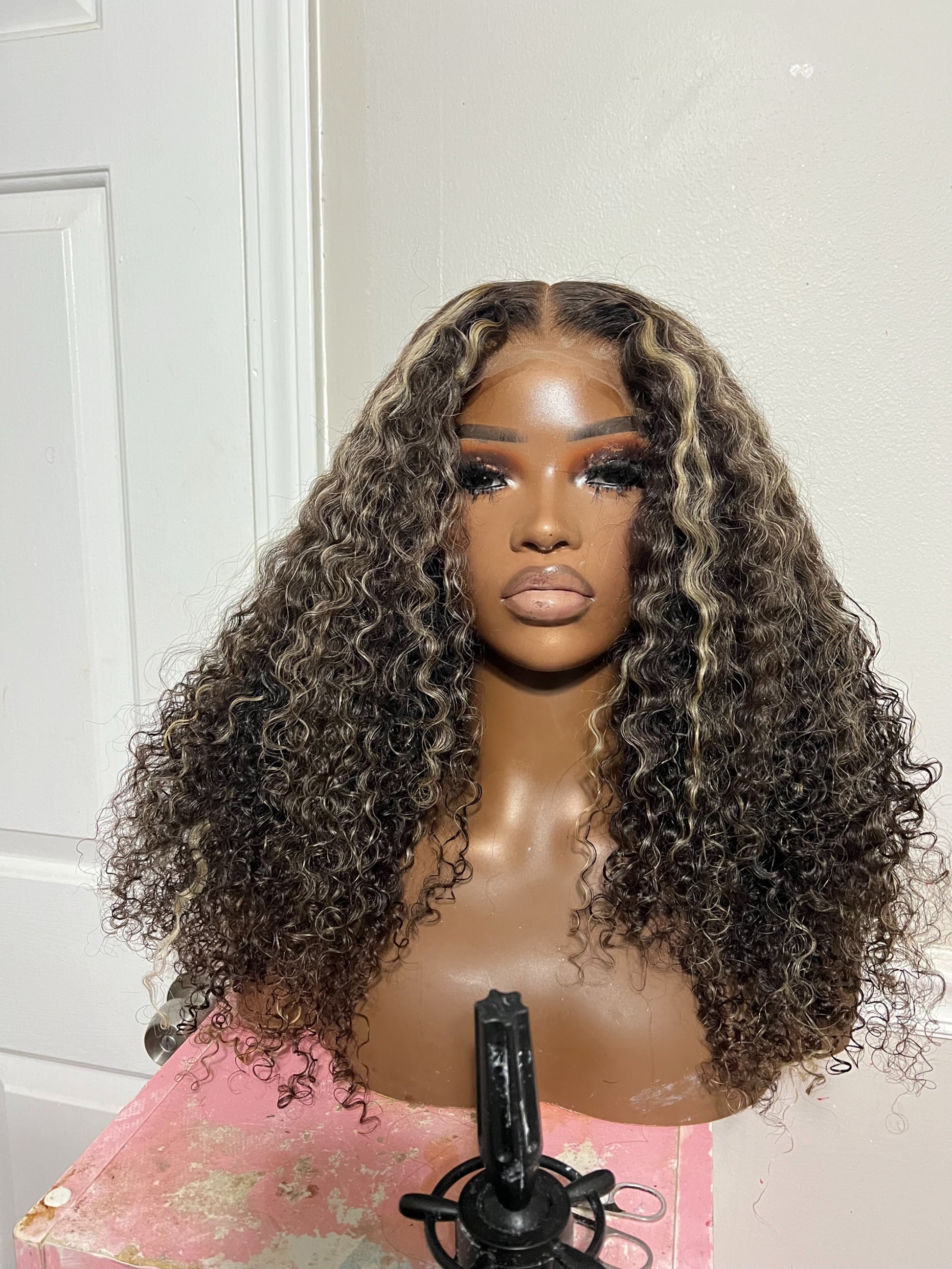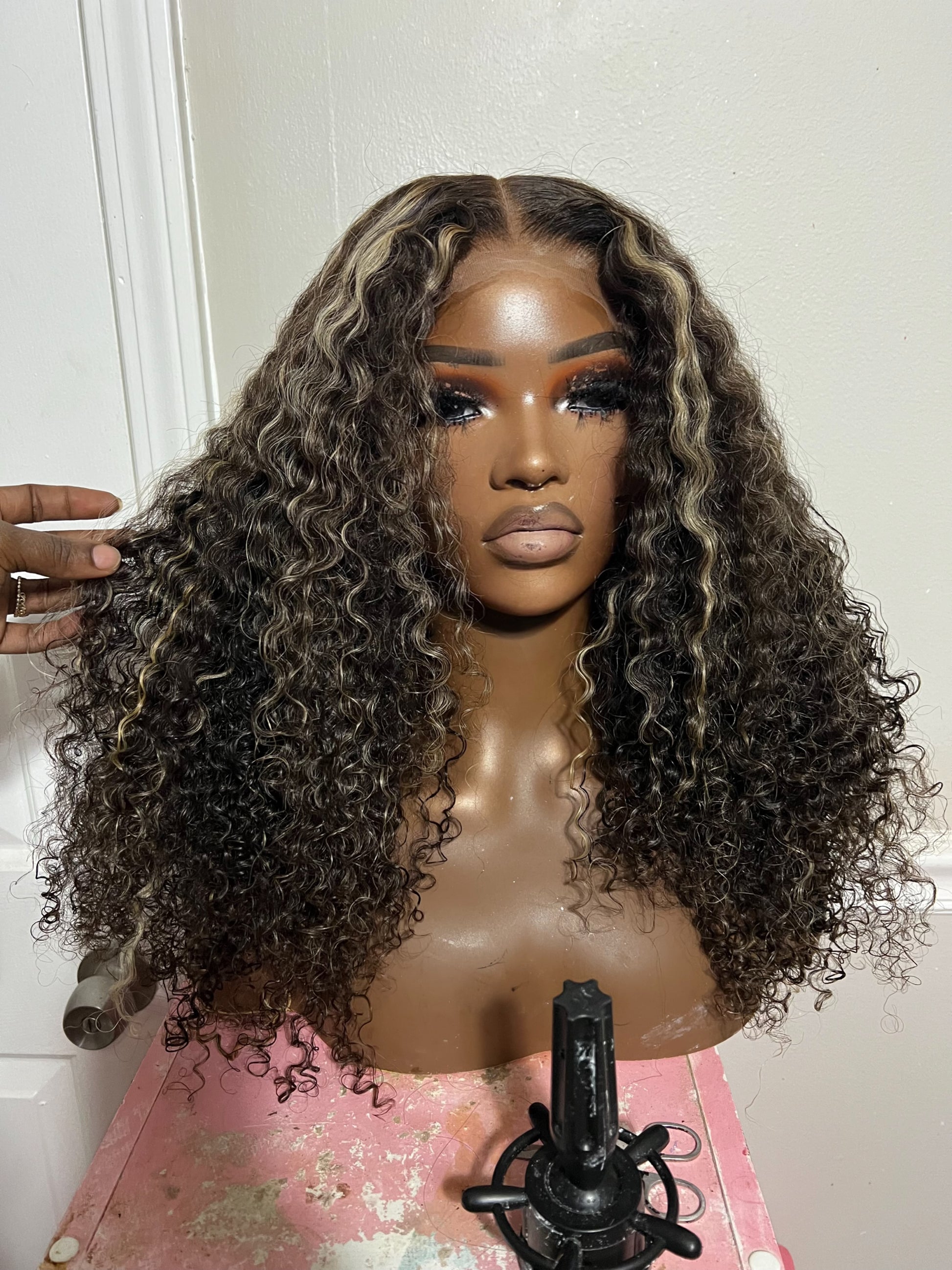 5x5 HD lace closure with 3 bundles of Burmese curly virgin human hair. Unit is sewing machine constructed on black mesh dome cap using standard head size measurements. (See size chart on home page) This unit is Custom colored with added Blonde highlights on 1b base. All units come ready to wear with a pre-pre-plucked hairline, bleached knots and styled to your liking or photo above.( middle part, curls) & ready to wear. All custom wigs Include an adjustable elastic band and 1-2 combs in the nape for a glue-less fit.