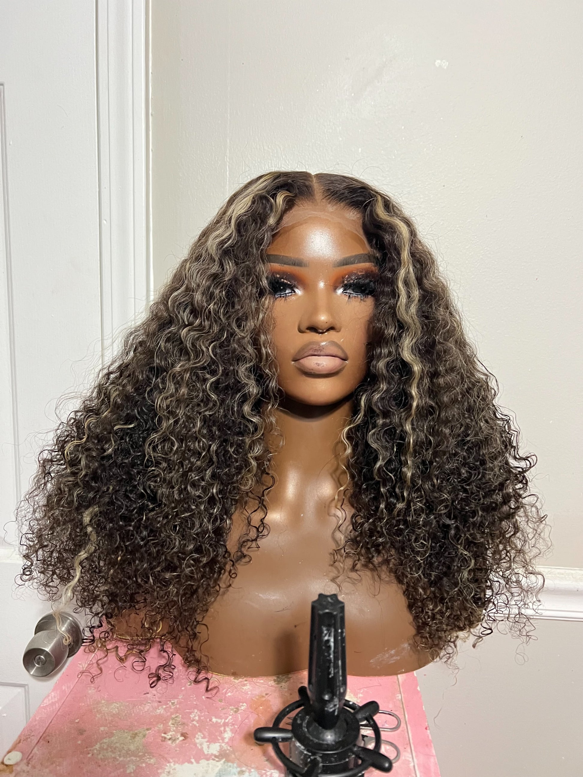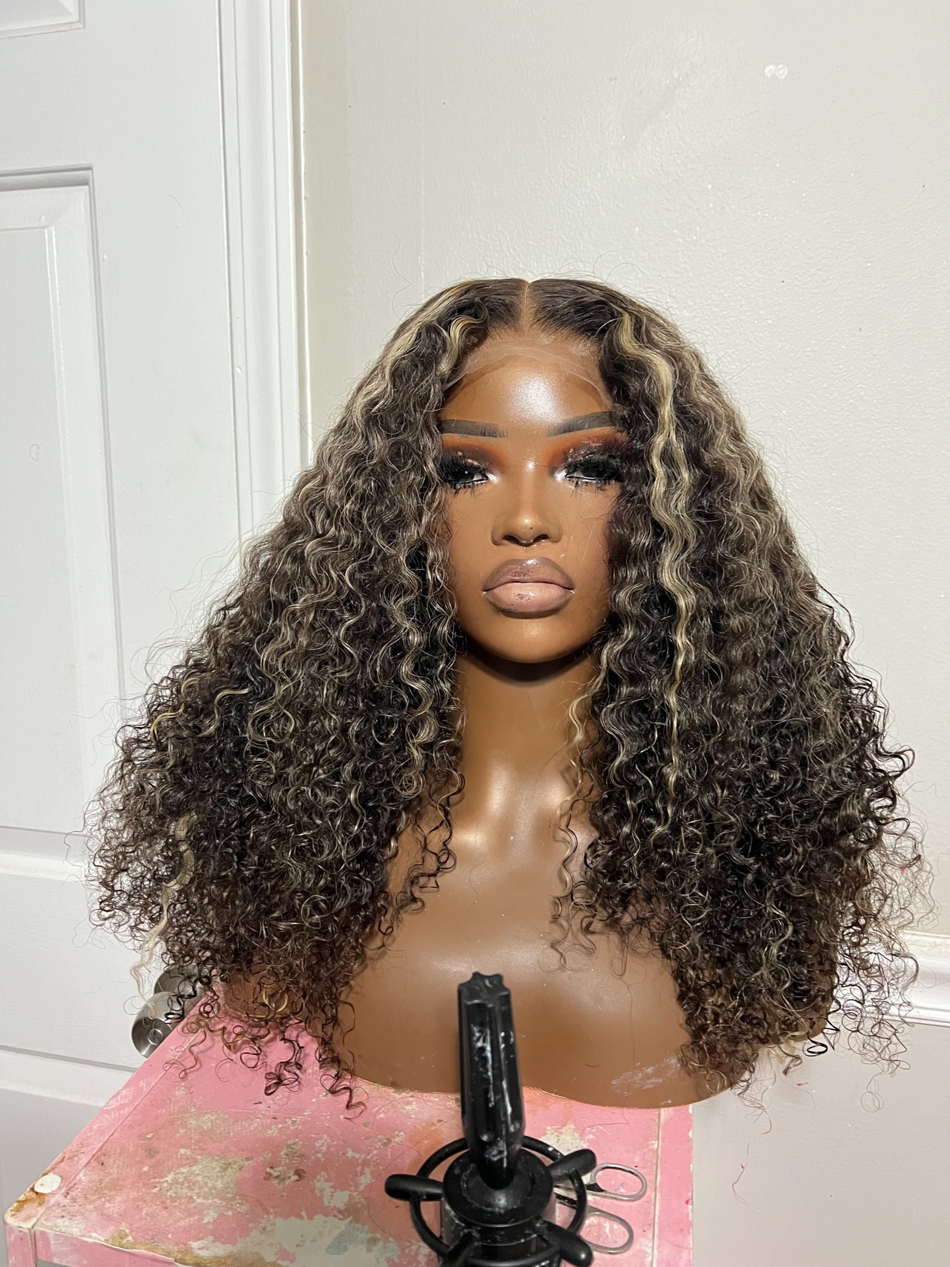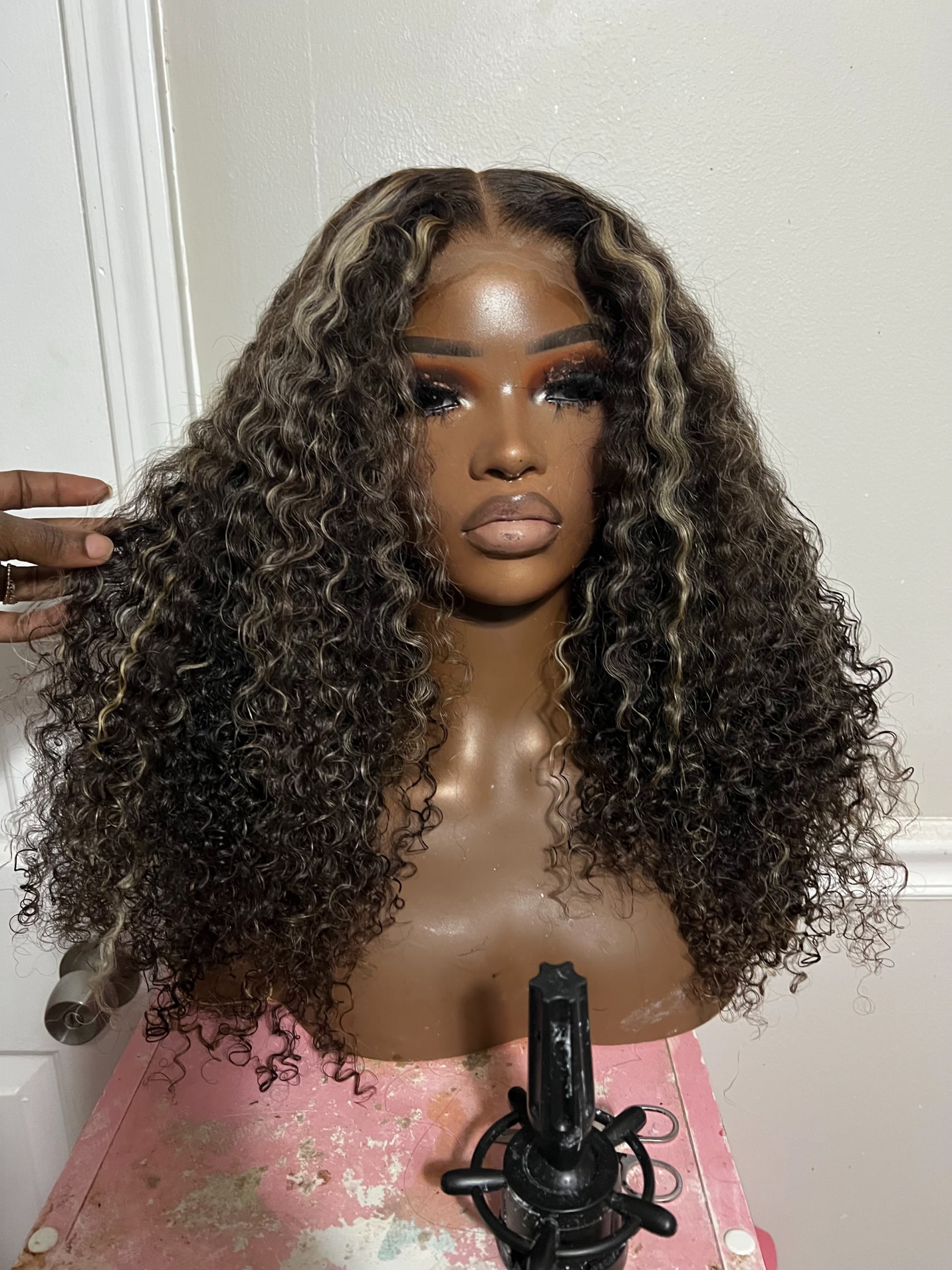 5x5 HD lace closure with 3 bundles of Burmese curly virgin human hair. Unit is sewing machine constructed on black mesh dome cap using standard head size measurements. (See size chart on home page) This unit is Custom colored with added Blonde highlights on 1b base. All units come ready to wear with a pre-pre-plucked hairline, bleached knots and styled to your liking or photo above.( middle part, curls) & ready to wear. All custom wigs Include an adjustable elastic band and 1-2 combs in the nape for a glue-less fit.