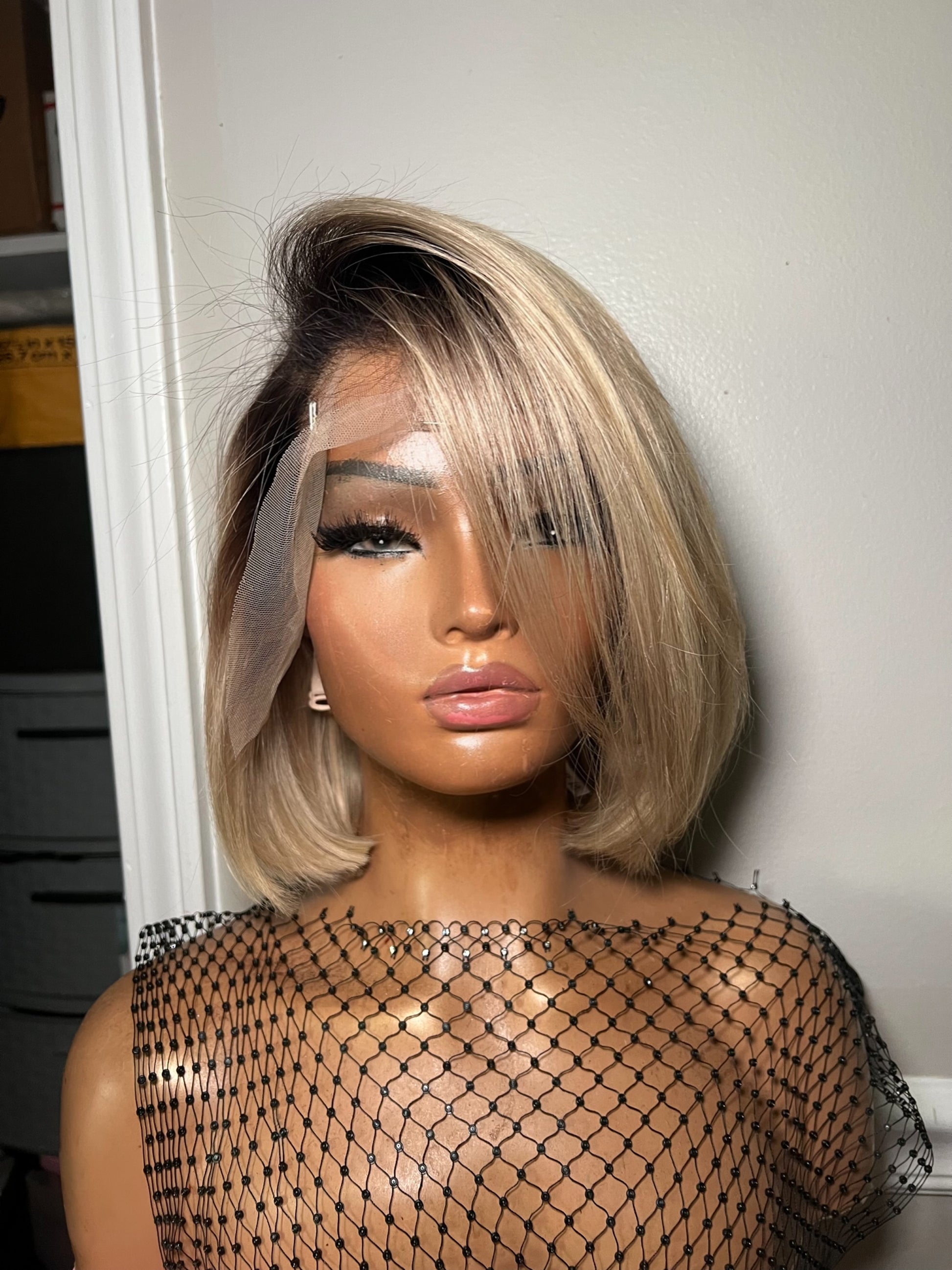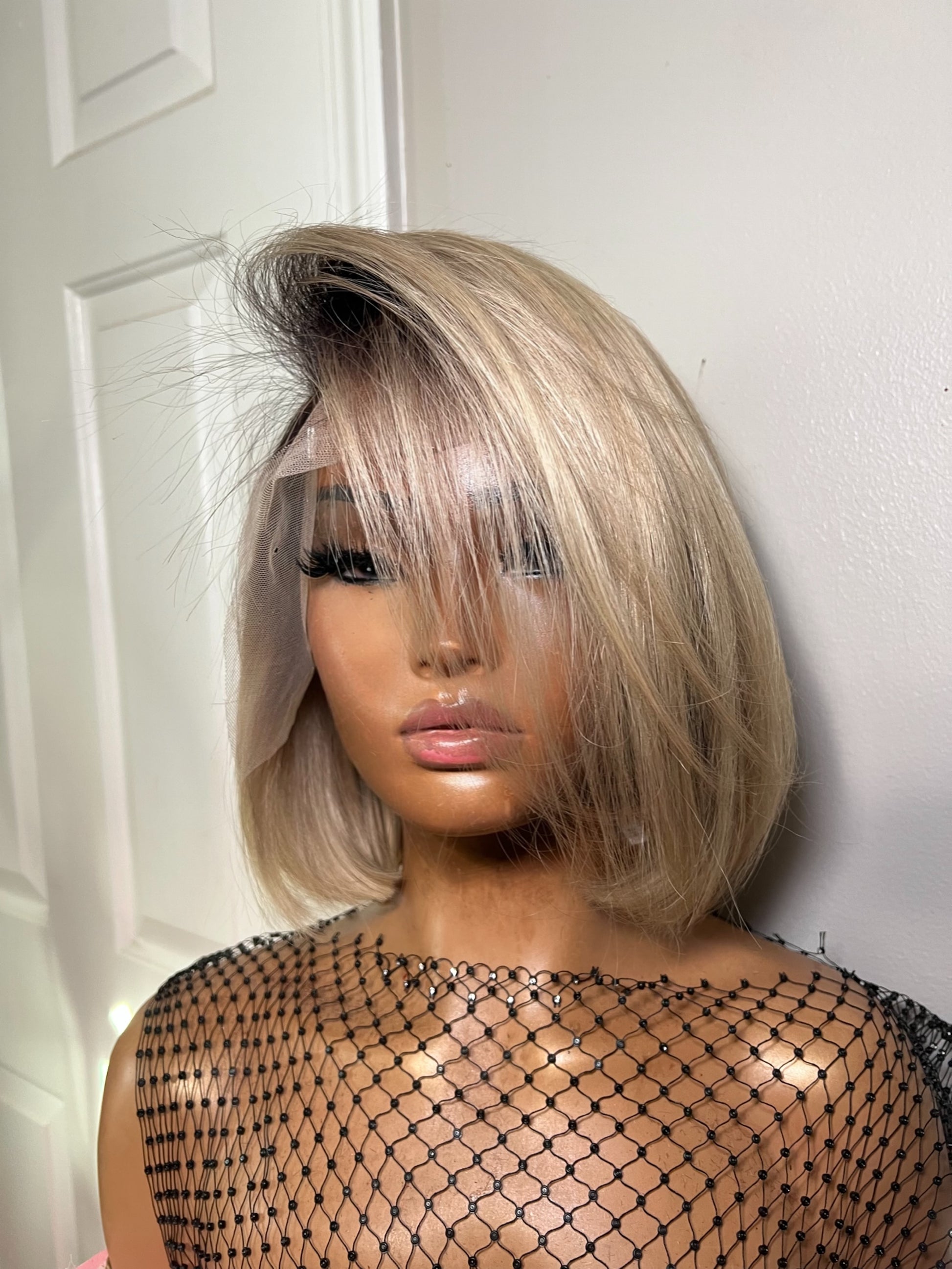 13x4 trans lace frontal premade factory unit . Unit is Pre made with medium cap. ". Custom toned beige blonde with dark roots cut to bob . All units come ready to wear with a preplucked hairline, bleached knots and styled to your liking.( middle part, curls) & ready to wear.