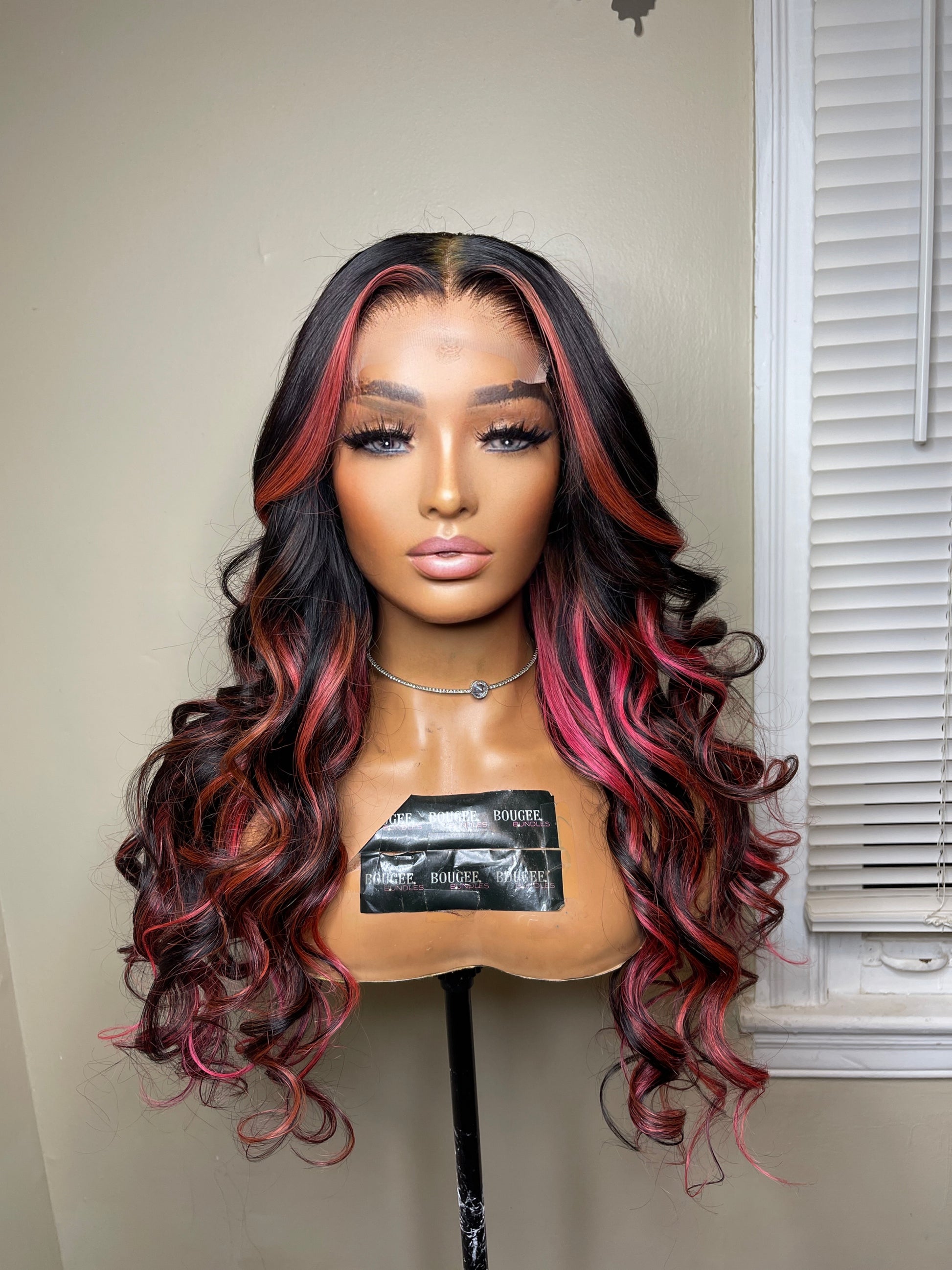 4x4 transparent lace closure 22”inch unit custom colored with pinkhighlights. All units are machine made on mesh dome cap. All wigs come preplucked, knots bleached and ready to wear