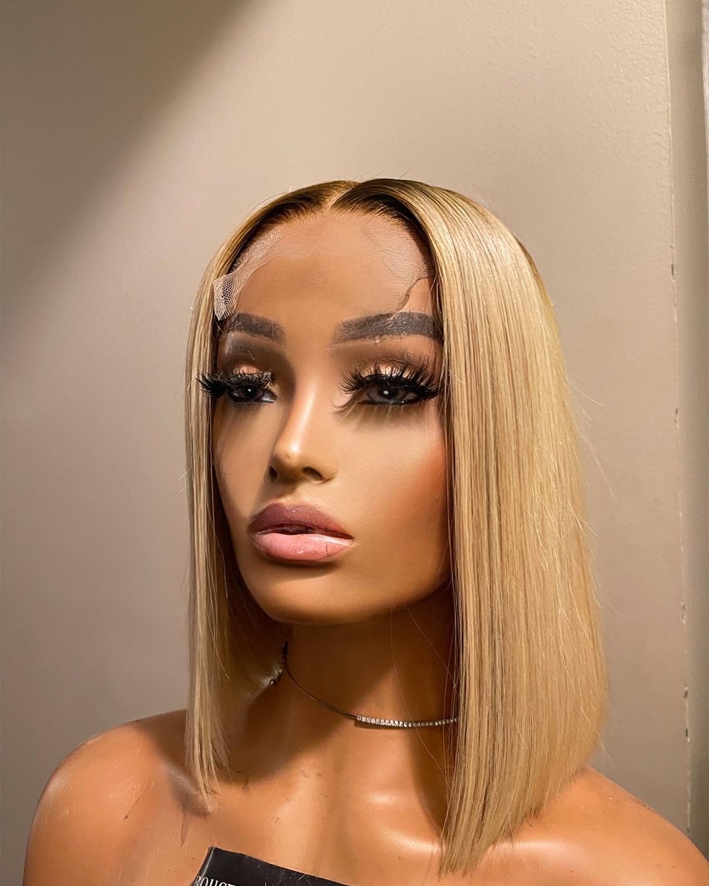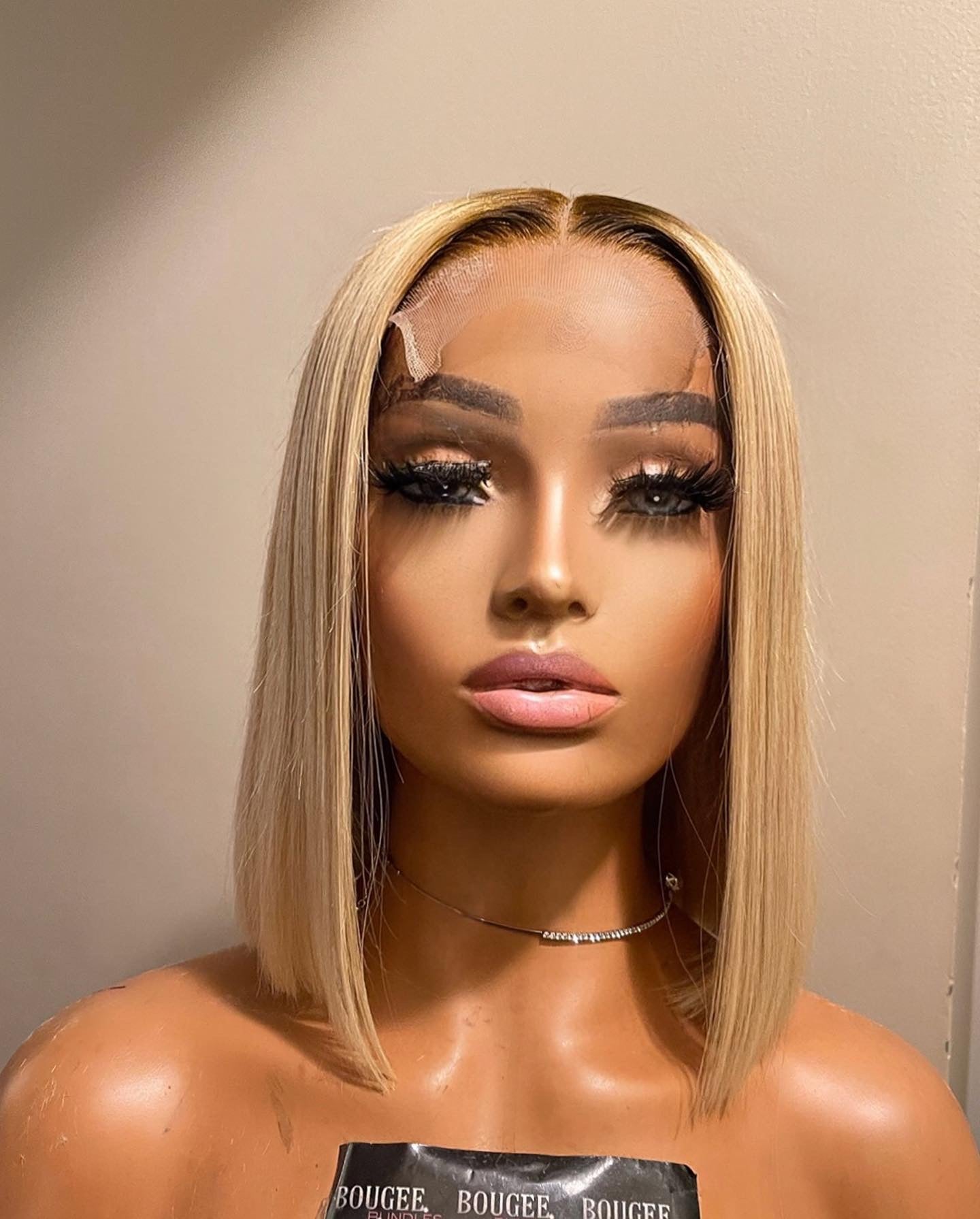 4x4 transparent lace closure 3 bundles of 613 blonde hair. Custom machine made on mesh dome cap. Can be worn glueless