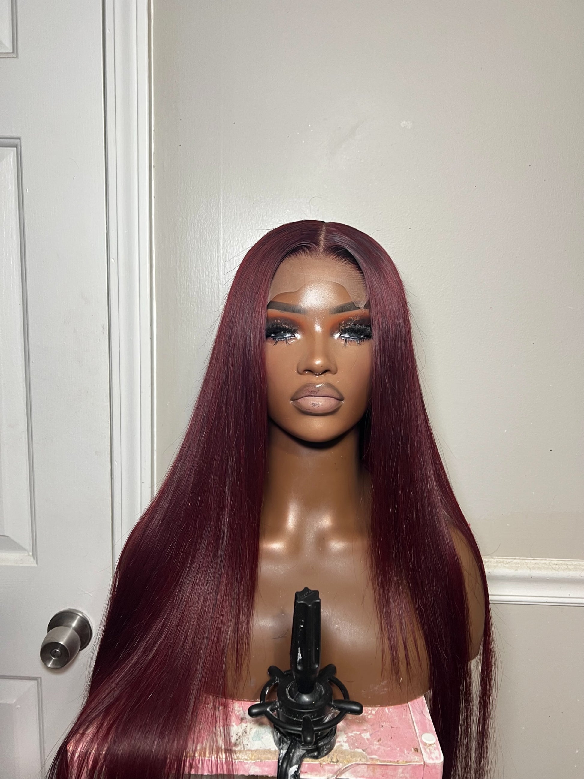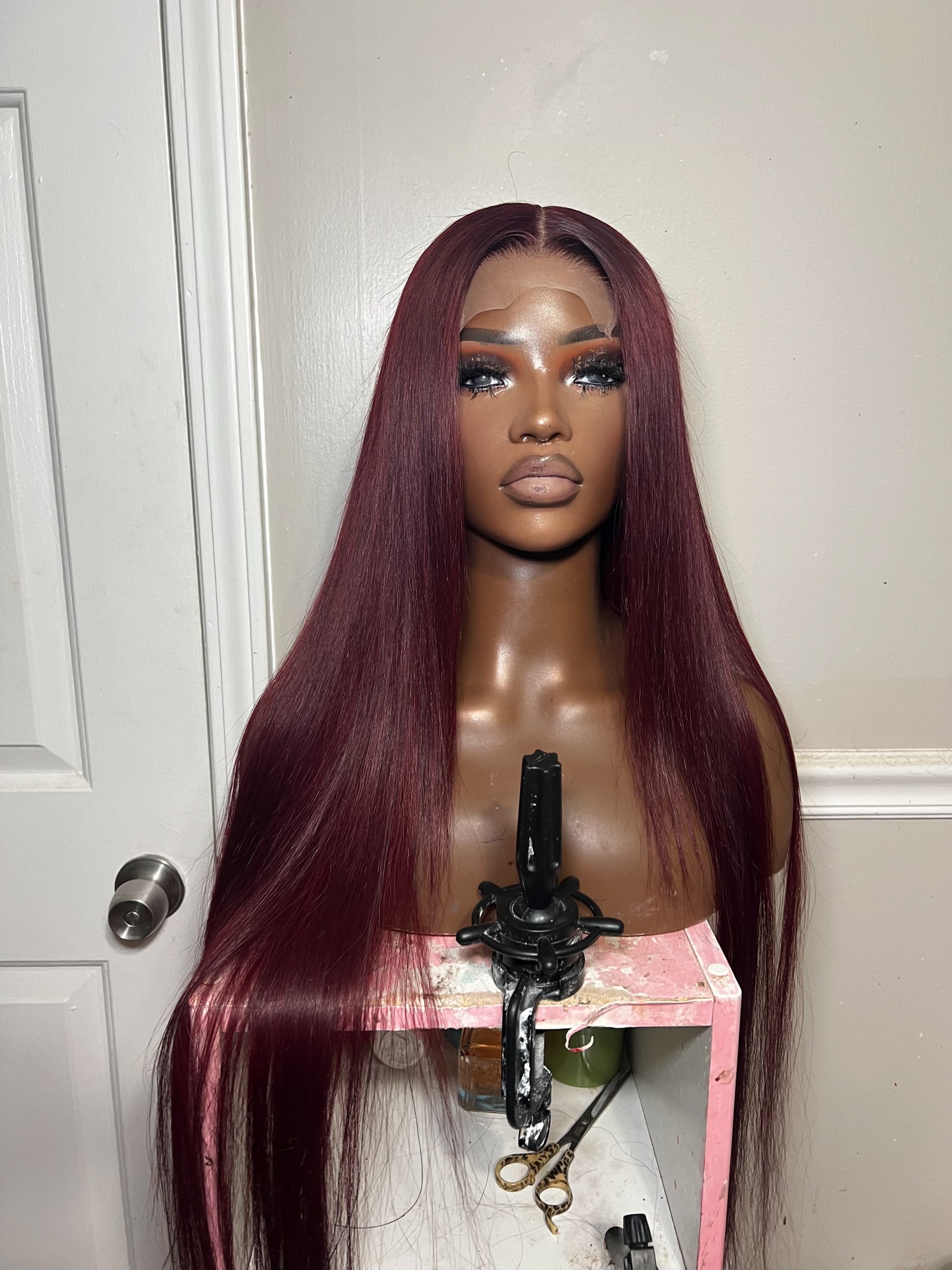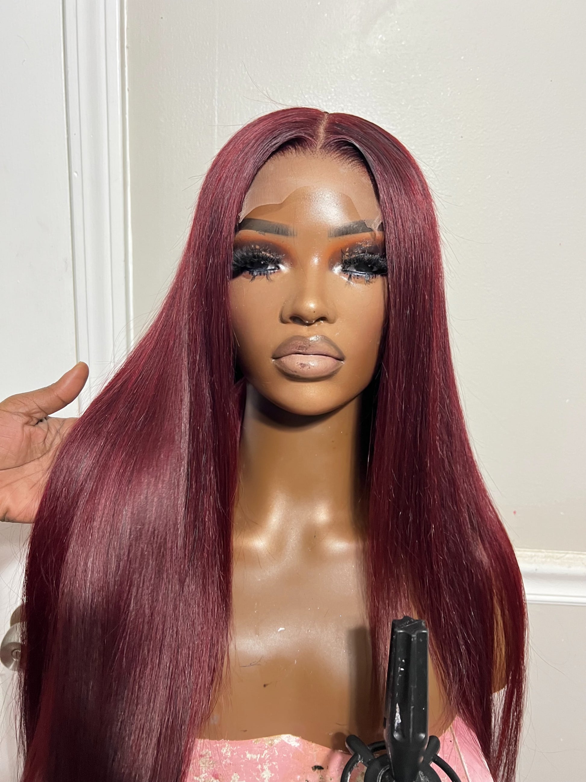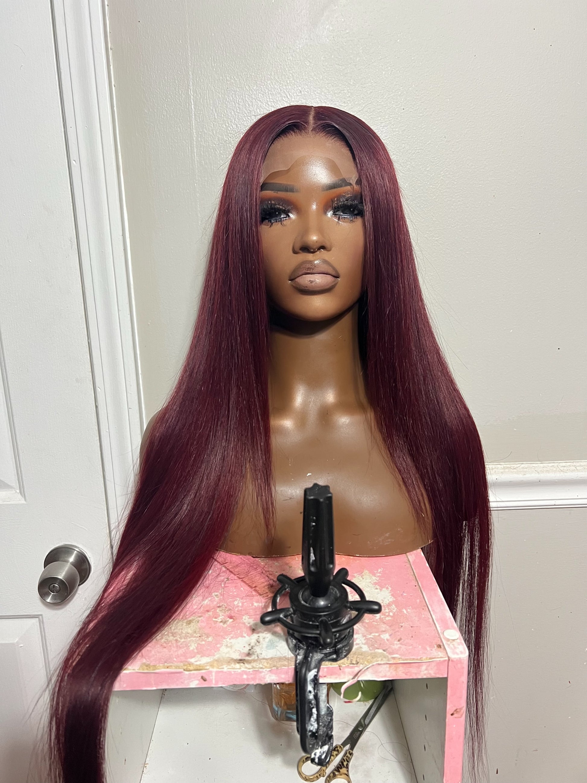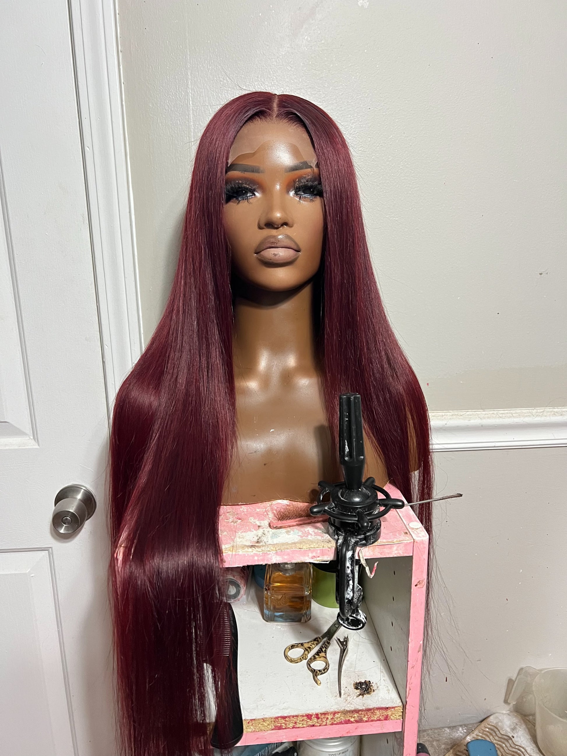 4x4 trans lace closure with 3 bundles of bodywave from our Baddie on a budget collection… 7a grade hair quality bundles. Unit is sewing machine constructed on black mesh dome cap.. custom colored red/ burgundy. All units come ready to wear with a preplucked hairline, bleached knots and styled to your liking.( middle part, curls) & ready to wear. Includes adjustable elastic band and combs for a glueless fit